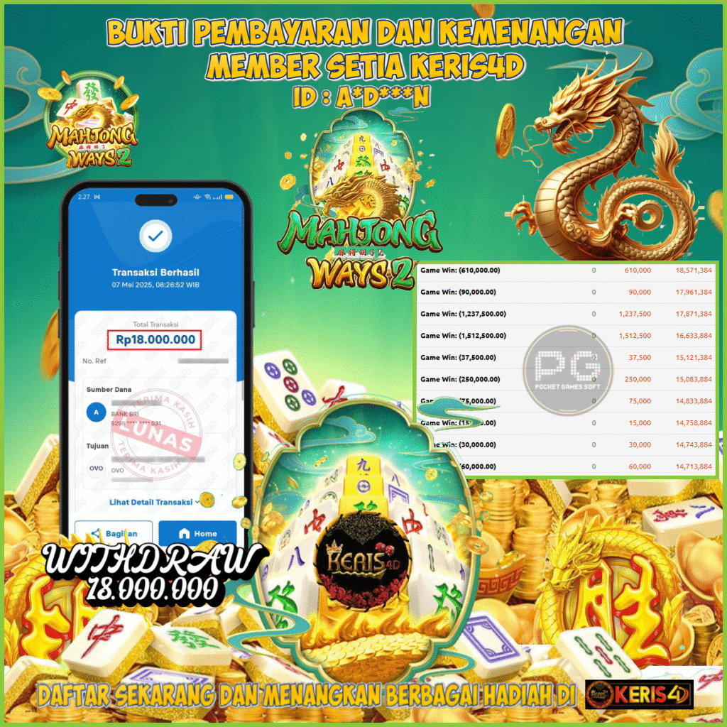 KERIS4D dikenal sebagai situs terpercaya yang selalu menghadirkan pengalaman bermain slot online yang aman, fair, dan berlisensi resmi. Di sini, kami tidak hanya sekadar memberikan janji, tapi bukti nyata berupa slip kemenangan yang dapat Anda lihat secara langsung.