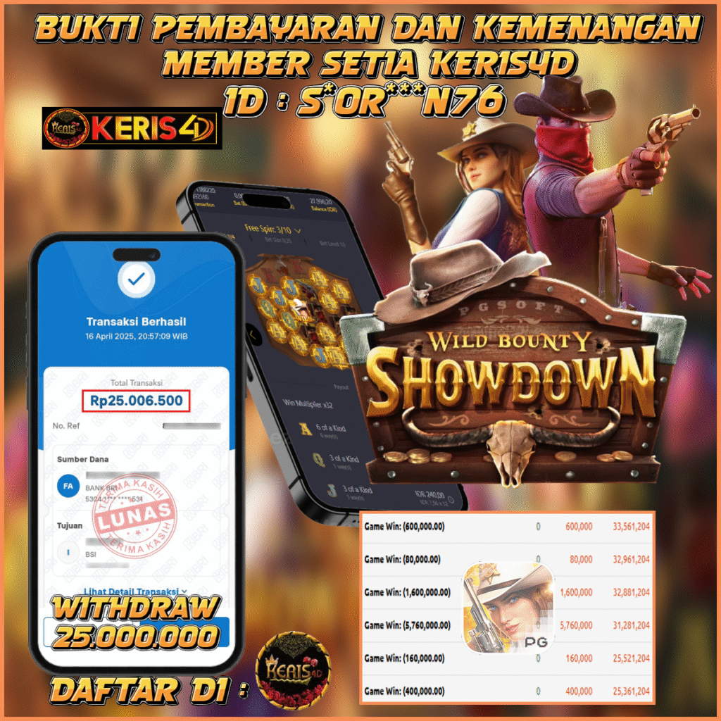 Setiap hari, member KERIS4D berhasil meraih jackpot besar dari berbagai provider slot ternama yang kami sediakan, seperti Pragmatic Play, Habanero, PG Soft, dan masih banyak lagi. Kami secara rutin menampilkan bukti screenshot atau rekapan kemenangan yang berhasil diraih, mulai dari kemenangan ratusan ribu hingga puluhan juta rupiah. Semua slip kemenangan ini kami hadirkan untuk membuktikan bahwa di KERIS4D, peluang menang itu nyata.